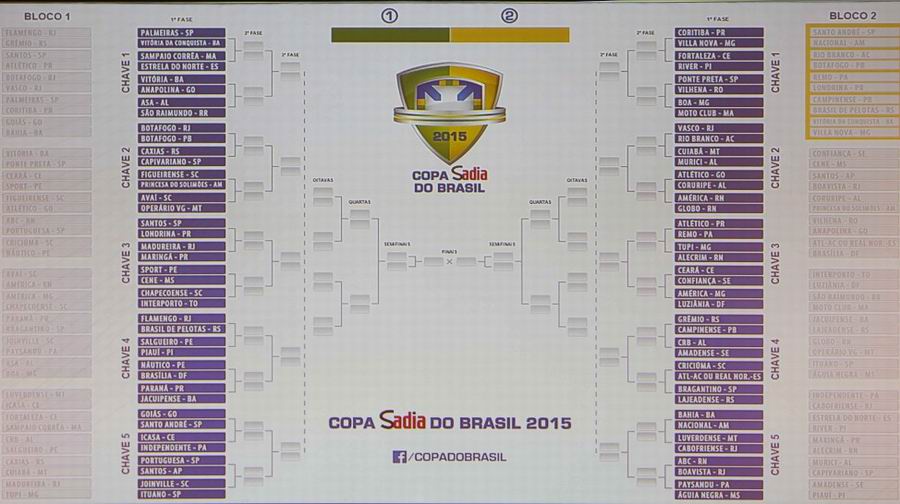 O sorteio realizado pela Confederação Brasileira de Futebol (CBF) nesta terça-feira (16) definiu os adversários dos clubes goianos na Primeira Fase da Copa do Brasil 2015. De acordo com o sistema adotado pela CBF, os 80 clubes participantes foram divididos em dois grupos. Confira abaixo os adversários dos três representantes goianos e chaveamento da competição: